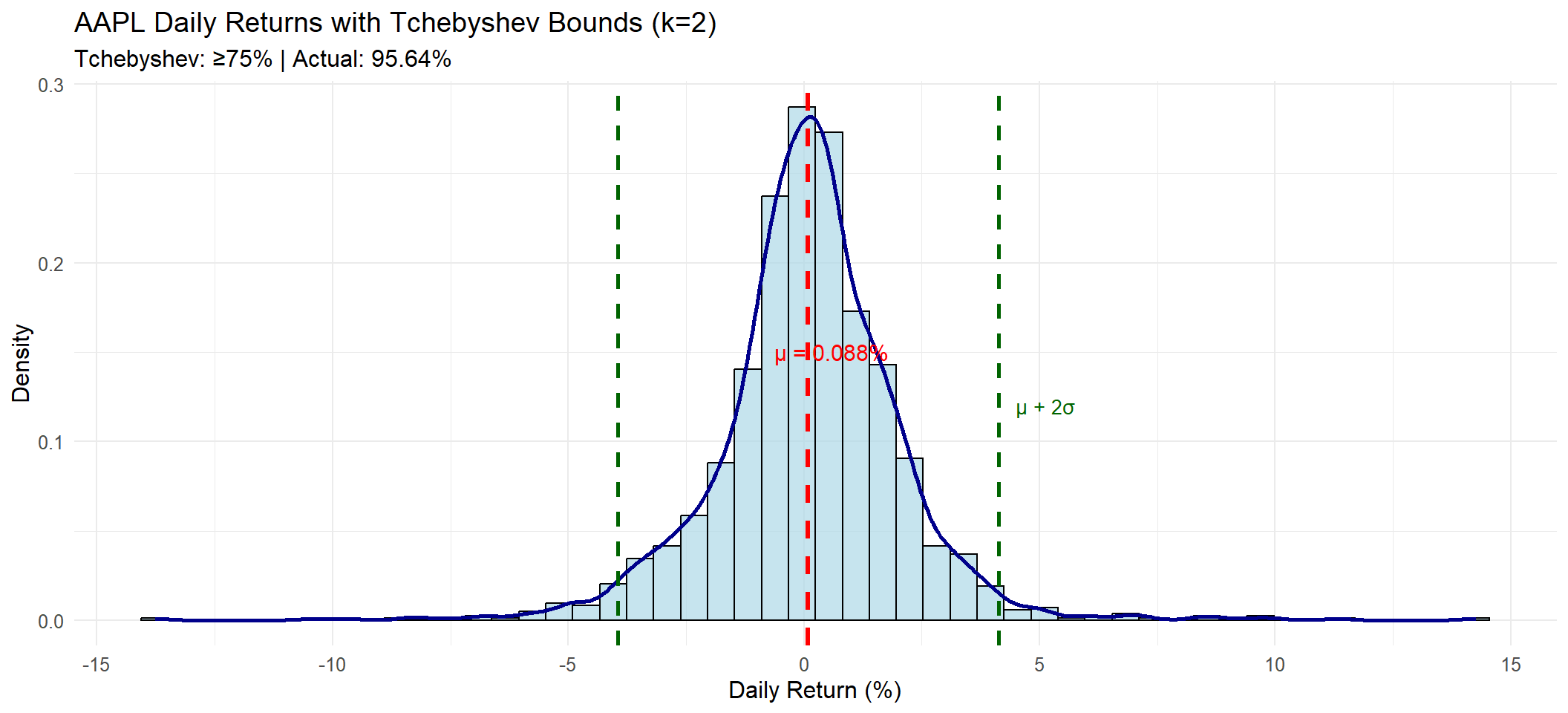 Problem 1: Corporate Earnings: A company’s quarterly earnings per share (EPS) has a mean of \(\mu = \$2.50\) and standard deviation \(\sigma = \$0.40\). Use Tchebyshev to find the minimum probability that EPS falls between \(\$1.50\) and \(\$3.50\).
